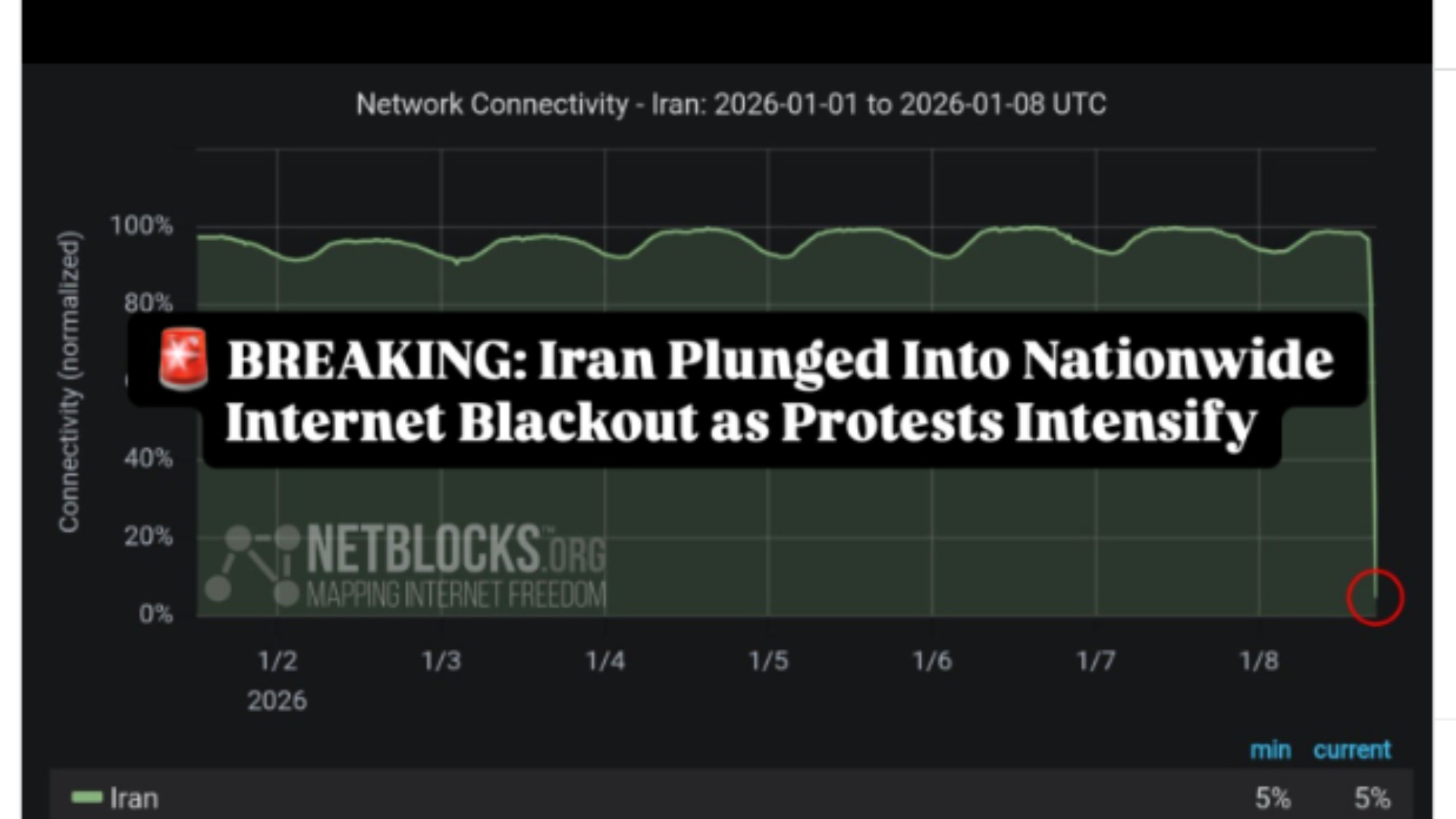 অর্থনৈতিক সংকট ঘিরে চলমান বিক্ষোভের মধ্যে ইরানজুড়ে ইন্টারনেট সংযোগ বিচ্ছিন্ন হয়ে গেছে বলে জানিয়েছে অনলাইন পর্যবেক্ষণ সংস্থা নেটব্লকস।এক প্রতিবেদনে এ খবর দিয়েছে সংবাদমাধ্যম আল জাজিরা। স্থানীয় সময় বৃহস্পতিবার (৮ জানুয়ারি) সামাজিক যোগাযোগমাধ্যমে দেয়া এক পোস্টে নেটব্লকস জানায়, এই ‘ব্ল্যাকআউট’ দেশব্যাপী বিক্ষোভকে লক্ষ্য করে নেয়া ক্রমবর্ধমান ডিজিটাল সেন্সরশিপের অংশ এবং এটি ‘গুরুত্বপূর্ণ সময়ে জনগণের যোগাযোগের অধিকারকে মারাত্মকভাবে ব্যাহত করছে’। গেল বছরের ডিসেম্বরের শেষ দিক থেকে ইরানের বিভিন্ন শহরে বিক্ষোভ ছড়িয়ে পড়ে। লাগামহীন মূল্যস্ফীতি, নিত্যপণ্যের মূল্যবৃদ্ধি এবং স্থানীয় মুদ্রার অবমূল্যায়ন এ বিক্ষোভের মূল কারণ বলে মনে করা হচ্ছে। স্থানীয় গণমাধ্যম ও সরকারি সূত্রের বরাতে সংবাদ সংস্থা এএফপির হিসাবে জানা গেছে, বিক্ষোভ শুরুর পর থেকে নিরাপত্তা বাহিনীর সদস্যসহ অন্তত ২১ জন নিহত হয়েছেন। তবে এ সংখ্যা আরও বেশি বলে দাবি অনেক বেসরকারি সংস্থার। বিস্তারিত আসছে...
