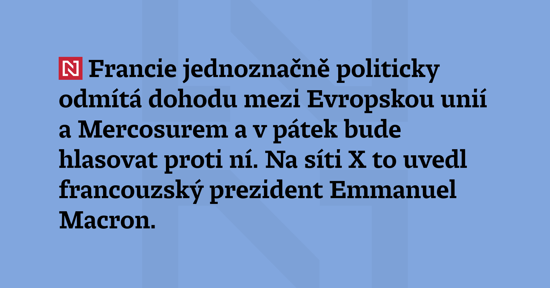Francie jednoznačně politicky odmítá dohodu mezi Evropskou unií a Mercosurem a v pátek bude hlasovat proti ní. Na síti X to uvedl francouzský prezident Emmanuel Macron.