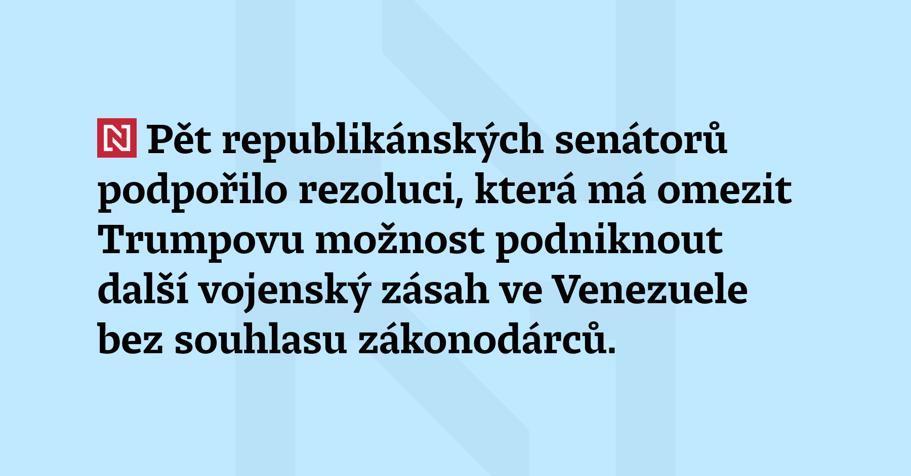 Pět republikánských senátorů podpořilo rezoluci, která má omezit možnost Trumpa podniknout další vojenský zásah ve Venezuele bez souhlasu zákonodárců. Trump po procedurálním hlasování zaútočil na zákonodárce v příspěvku na síti Truth Social a uvedl, že „by již nikdy neměli být zvoleni do úřadu“ a že opatření, které podpořili, „výrazně brání americké sebeobraně a národní bezpečnosti“. (Politico)
