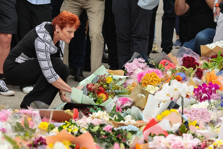 Pauline Hanson, Senator for Queensland in the Australian Senate and leader of One Nation party, lays flowers outside Bondi Pavilion in Sydney on December 16, 2025, to honour victims of the Bondi Beach shooting. Australia's leaders have agreed to toughen gun laws after attackers killed 15 people at a Jewish festival on Bondi Beach, the worst mass shooting in decades decried as antisemitic "terrorism" by authorities. (Photo by DAVID GRAY / AFP via Getty Images)