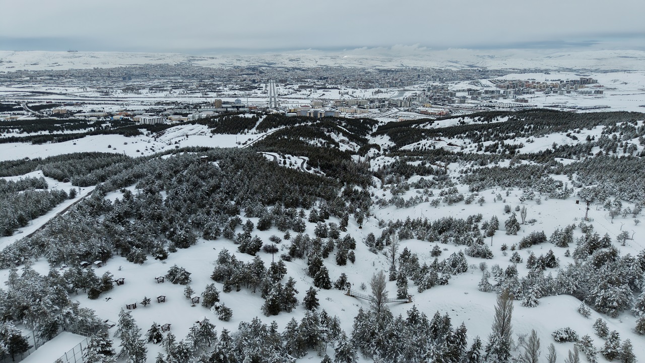 SİVAS'ta kent merkezine hakim bir noktada bulunan ve çam ağaçlarının yoğunlukta olduğu Kardeşler Ormanı'nda kar yağışı ile ortaya çıkan manzara havadan görüntülendi.
