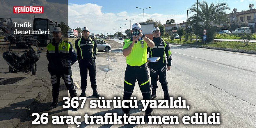 367 sürücü yazıldı, 26 araç trafikten men edildi Trafik Ekipleri tarafından, ülke genelinde dün gerçekleştirilen trafik denetimlerinde 367 sürücü yazıldı; 26 araç ise trafikten men edildi.