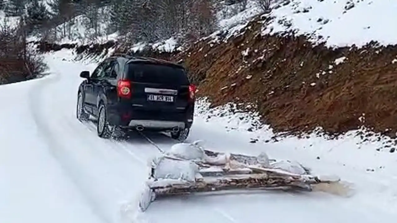 Gümüşhane’nin Torul ilçesine bağlı Cebeli köyünde, kar yağışı sonrası kapanan yolu köylüler kendi geliştirdikleri yöntemle ulaşıma açtı.