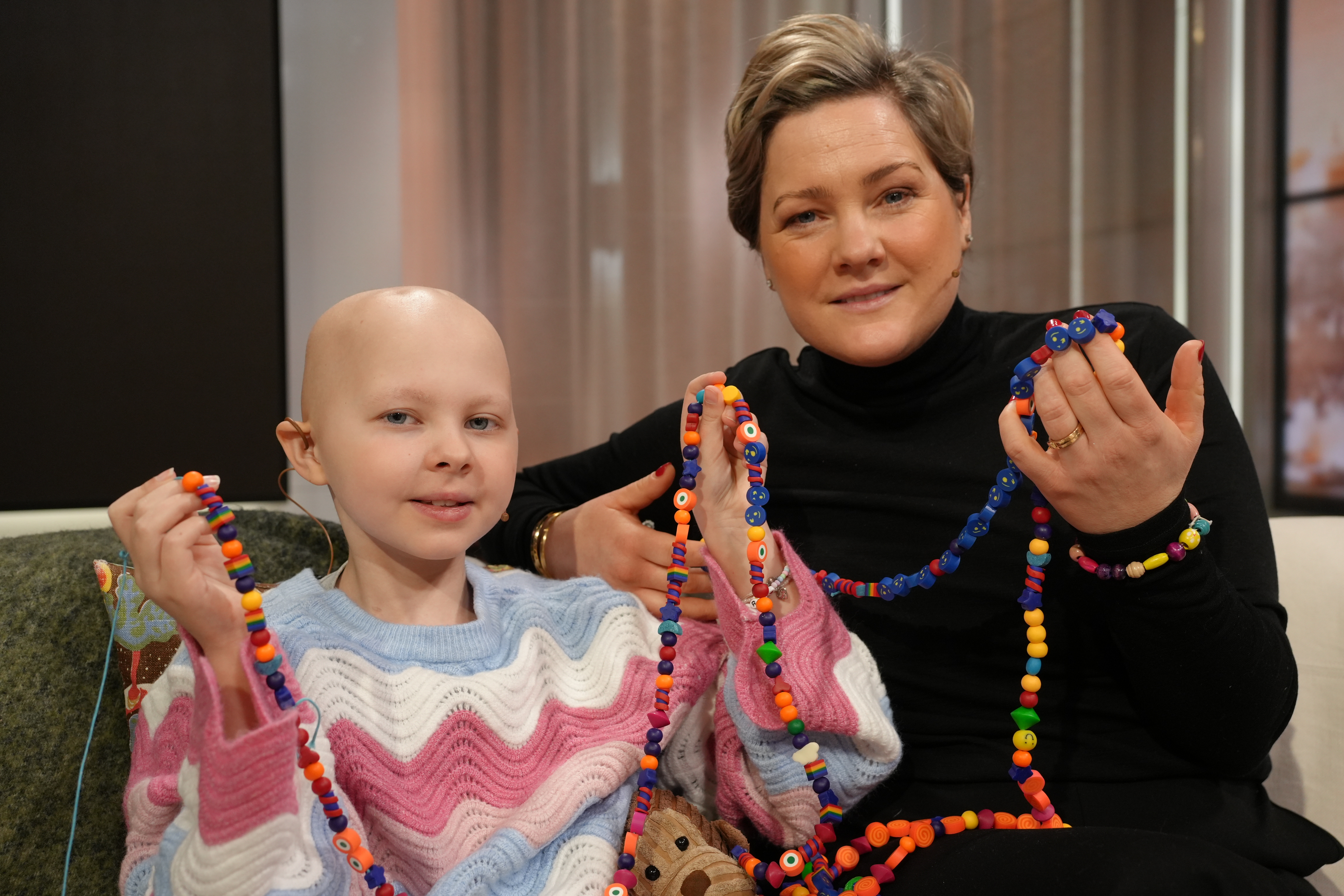 Clara började må illa och fick huvudvärk för drygt ett år sedan. Efter flera läkarbesök och en första felaktig diagnos visade det sig vara medulloblastom, en ovanlig och aggressiv hjärntumör. – När svaret kom att det var cancer… Från mjölkallergi till cancer, det var ett väldigt stort hopp och en stor chock, säger Claras mamma Anna Stenbeck. ”Försvinner jag” Anna Stenbeck berättar att dottern Clara oroade sig över hur cancern skulle påverka henne. – När hon ställde frågan om det är en cancer man dör av så var det frågan som vi själva också bar, säger Anna Stenbeck. Hon förklarade för Clara att det var något positivt att läkarna nu visste vilken sorts cancer det handlade om, för det betydde att de kunde påbörja rätt behandling. – Då blev den svåra frågan: Vad händer om cancern inte försvinner, försvinner jag då? Det går inte att svara med ord på det... Det blir tårar och kramar, säger mamma Anna Stenbeck. Stöd från familjen och supersnöret Under året har Clara genomgått 30 strålbehandlingar, 27 blodtransfusioner och bott över 200 nätter på sjukhus - så många nätter att hon själv har tappat räkningen. – Men jag vet att det har varit väldigt, väldigt, väldigt länge, säger Clara. Hon bär med sig sitt supersnöre som även hjälper henne minnas alla behandlingar hon har gått igenom i samband med cancerbehandlingen. Hittills har hon samlat nästan 500 pärlor. Varje pärla symboliserar en utmaning eller behandling och sträcker sig längre än Clara själv. Hon förklarar att den lilla ambulanspärlan betyder att hon fick åka ambulans till sjukhuset, och att den gröna pärlan bredvid symboliserar intensivvården som följde. Skratt och lek mitt i allvaret Trots allvarlig sjukdom har Clara och hennes familj försökt hitta ljusglimtar i vardagen. Humor och lek har blivit viktiga verktyg för att orka med den tuffa tiden. – Det är otroligt viktigt. Clara är ett allvarligt sjukt barn. I det är det lätt att tappa bort barnet. Hon är allvarligt sjuk, men hon är fortfarande ett barn, säger mamma Anna Stenbeck. Clara har också fått stöd av sin storebror Max. – Han är snäll, omtänksam och rolig, säger Clara. Nu väntar den sista behandlingen och förhoppningsvis är den sista pärlan inte långt ifrån.