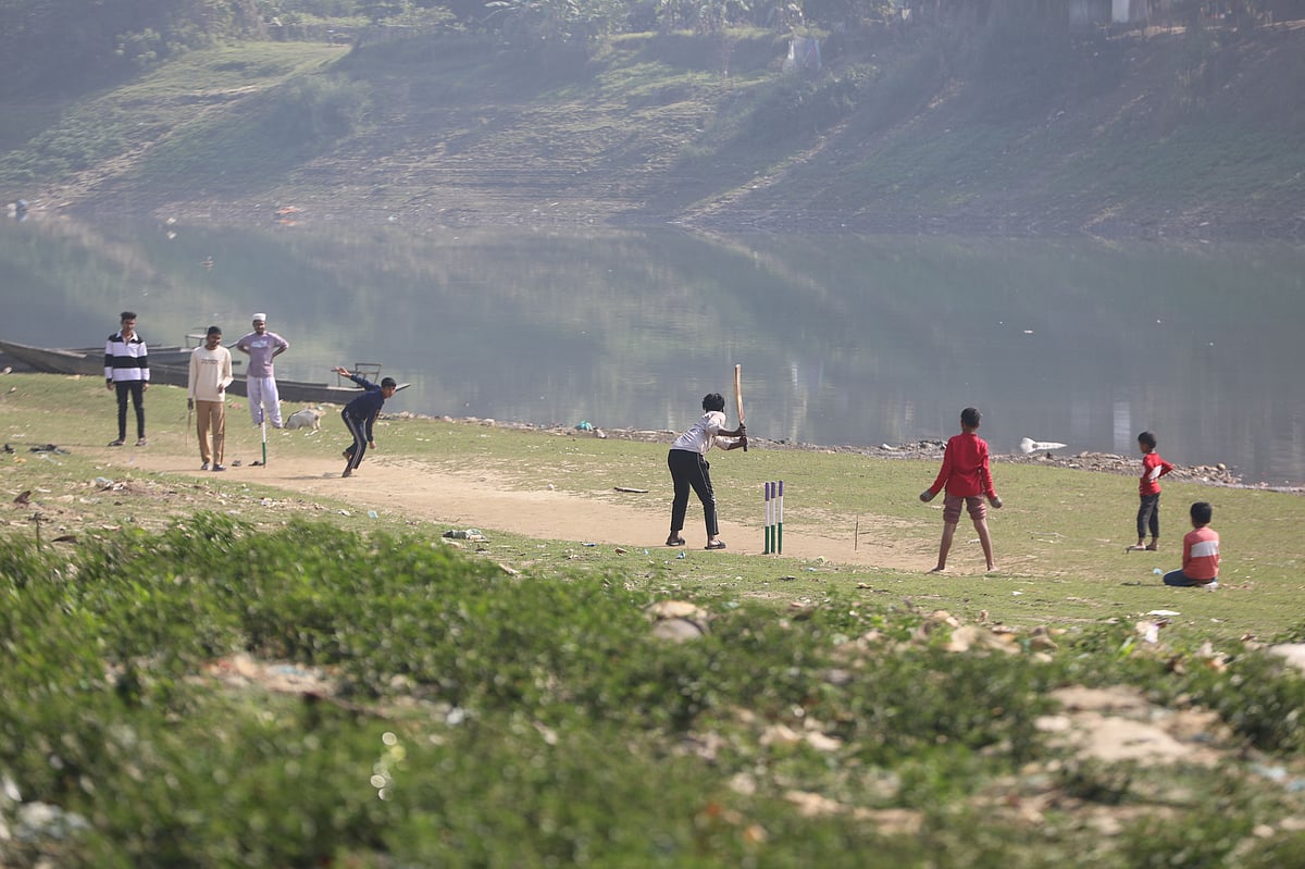 শীতকালে কমে এসেছে সিলেটের সুরমা নদীর পানি। জেগে উঠেছে বালুচর। বর্ষায় যেখানে ছিল অথই জল, এখন সেখানে ব্যাট-বল হাতে ক্রিকেটে মেতে উঠেছে নদীপারের শিশু-কিশোরেরা। খেলার মাঠের অভাব থাকলেও অবসরের আনন্দ থেমে নেই তাদের। সুরমা নদীর ঘাসিটুলা এলাকার চর থেকে তোলা ছবি।