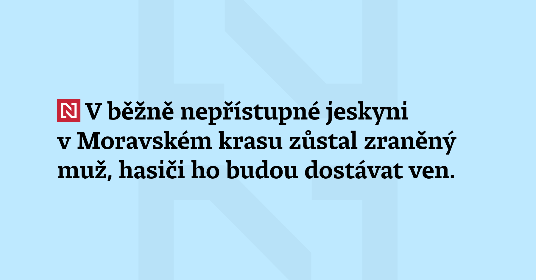 V běžné nepřístupné jeskyni v Moravském krasu zůstal zraněný muž, hasiči ho budou dostávat ven. Je až v 70 metrové hloubce a až 300 metrů od vstupu. Na místě je vrtulník s leteckými záchranáři, dobrovolné jednotky, hasiči povolali speciální techniku, střelmistry a spolupracují i se speleologickými záchranáři. (ČTK, HZS Jihomoravského kraje)