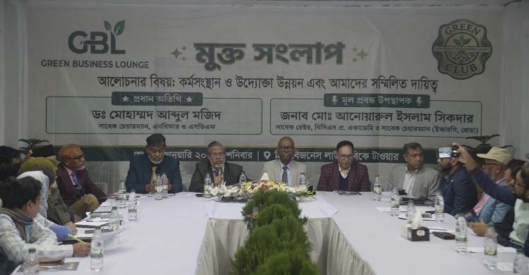 দেশের বেকারত্ব দূরীকরণ ও অর্থনৈতিক সমৃদ্ধি অর্জনে ‘চাকরি করবো না, চাকরি দেবো’—এই মন্ত্রকে জাতীয় স্লোগানে পরিণত করার আহ্বান জানিয়েছেন বিশিষ্ট অর্থনীতিবিদ ও এনবিআরের সাবেক চেয়ারম্যান ড. মোহাম্মদ আবদুল মজিদ। তিনি বলেন, উদ্যোক্তা তৈরির মাধ্যমে দেশে একটি সামাজিক বিপ্লব ঘটাতে হবে এবং এর জন্য দক্ষ জনশক্তি গড়ে তোলা অপরিহার্য। শনিবার (১০ জানুয়ারি) রাজধানীর পুরানা পল্টনস্থ বি.কে টাওয়ারে ‘কর্মসংস্থান ও উদ্যোক্তা উন্নয়ন এবং আমাদের সম্মিলিত দায়িত্ব’ শীর্ষক মুক্ত সংলাপে প্রধান অতিথির বক্তব্যে তিনি এসব কথা বলেন। গ্রীন কমিউনিটি এন্ট্রাপ্রেনিয়র ক্লাব লিমিটেড ও গ্রীন বিজনেস লাউঞ্জ যৌথভাবে এই সংলাপের আয়োজন করে। ড. মোহাম্মদ আবদুল মজিদ বলেন, দক্ষ জনশক্তি তৈরি করা উদ্যোক্তা হওয়ার অন্যতম প্রধান শর্ত। দক্ষ মানবসম্পদ ছাড়া আমরা আমাদের কাঙ্ক্ষিত অর্থনৈতিক লক্ষ্যে পৌঁছাতে পারবো না। তাই শিক্ষা ও প্রশিক্ষণের মাধ্যমে তরুণদের কর্মসংস্থান উপযোগী করে গড়ে তুলতে হবে। অনুষ্ঠানে মূল প্রবন্ধ উপস্থাপন করেন বিসিএস প্রশাসন একাডেমির সাবেক রেক্টর ও ঢাকা উত্তর সিটি করপোরেশনের সাবেক প্রশাসক মো. আনোয়ারুল ইসলাম সিকদার। তিনি কর্মসংস্থান ও উদ্যোক্তা উন্নয়নের ক্ষেত্রে বিদ্যমান চ্যালেঞ্জ ও সম্ভাবনাগুলো তুলে ধরে শিক্ষক, গবেষক, সরকারি কর্মকর্তা, সাংবাদিক, চিকিৎসক ও প্রকৌশলীসহ সমাজের সকল স্তরের মানুষের সম্মিলিত ভূমিকার ওপর গুরুত্বারোপ করেন। গ্রীন কমিউনিটি এন্ট্রাপ্রেনিয়র ক্লাব লিমিটেডের প্রেসিডেন্ট মো. আলতাফ হোসাইনের সভাপতিত্বে সভায় আরও বক্তব্য রাখেন সংগঠনের ভাইস-প্রেসিডেন্ট প্রফেসর ডা. রুহুল আমিন, ভূমি মন্ত্রণালয়ের সাবেক অতিরিক্ত সচিব আতাউর রহমান এবং আল-আরাফাহ ইসলামী ব্যাংকের প্রতিষ্ঠাতা পরিচালক নওয়াব আলী ভূঁইয়া। বক্তারা বলেন, কেবল সরকারের একার পক্ষে বিপুল জনগোষ্ঠীর কর্মসংস্থান নিশ্চিত করা সম্ভব নয়। এজন্য বেসরকারি খাতকে শক্তিশালী করতে হবে এবং নতুন উদ্যোক্তাদের জন্য বিনিয়োগবান্ধব পরিবেশ নিশ্চিত করতে হবে। অনুষ্ঠানে অন্যান্যদের মধ্যে বক্তব্য রাখেন সিটিজেন কেয়ার বাংলাদেশের প্রেসিডেন্ট মুনিরা পারভীন, ফ্যাশন ডিজাইন কাউন্সিলের প্রেসিডেন্ট আমাতুন নুর, নারী উদ্যোক্তা সালমা বেগম, কৃষিবিদ আনোয়ার হোসেন এবং বার্ড-এর সাবেক পরিচালক মো. আবদুল মান্নান। মুক্ত আলোচনায় বিভিন্ন পেশাজীবী ও শিক্ষার্থীরা উদ্যোক্তা হওয়ার ক্ষেত্রে তাদের অভিজ্ঞতা ও সমস্যার কথা তুলে ধরেন। ইএ