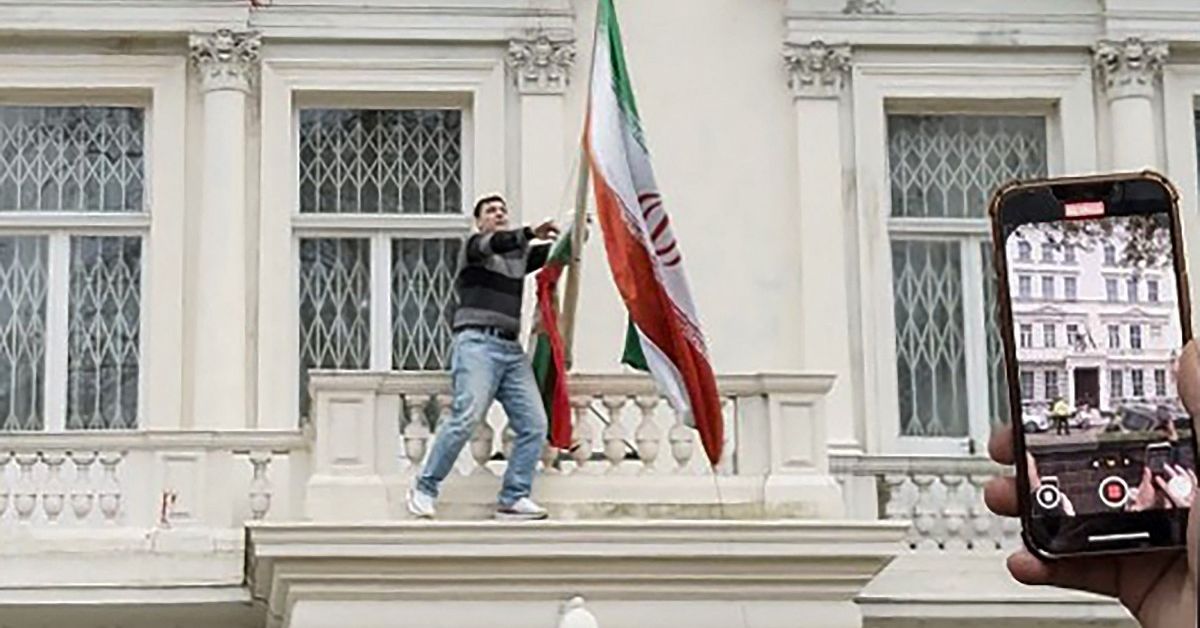 La bandera de la República Islámica de Irán, reemplazada brevemente por otra de la monarquía en Londres