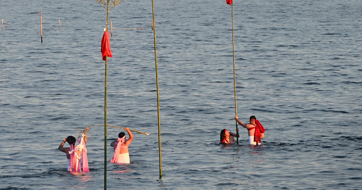 若者が極寒の海で「梵天立て」 五穀豊穣と大漁願う 千葉・木更津
