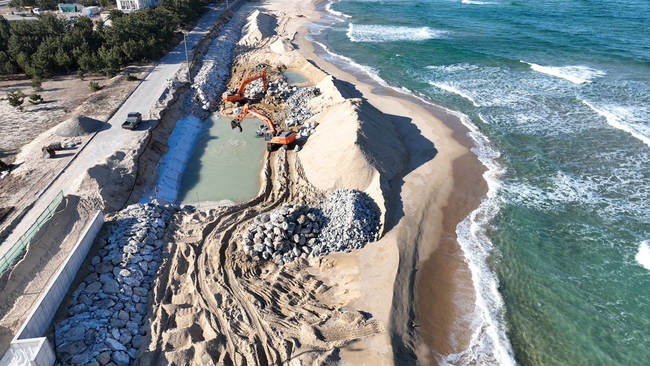 해안을 따라 곧게 뻗은 도로는 늘 편리함과 접근성이라는 이름으로 등장한다. 바다를 더 가까이에서 볼 수 있고, 이동이 쉬워졌다는 이유다. 그러나 이 길이 놓인 자리에는 파도와 모래가 오가며 숨 쉬던 해안의 시간이 멈춰 서 있다. 해안도로는 단순한 기반시설이 아니다. 그것은 움직이며 스스로 균형을 이루던 해안을 콘크리트 구조물로 고정한 선택의 결과다. 도로가 나면 파도의 흐름은 막히고, 모래는 더 이상 제자리를 찾지 못한다. 한 번 인위적으로 굳어진 해안은 스스로 회복할 수 없고, 침식과 붕괴는 서서히 진행된다. 결국 해안도로는 바다를 바라보기 위한 길이 아니라, 바다를 훼손의 현장으로 밀어 넣는 통로가 된다. 인간의 편의를 위해 선택된 곧은 길은 자연에게 되돌릴 수 없는 상처로 남는다. 해안은 도로를 위해 존재하지 않는다. 스스로 움직이고 변화하며 살아 있는 공간이다. 이 사실을 외면할 때, 해안은 침묵으로 저항한다. 무너지는 해안선과 연안 침식이 그 신호다. 편리함을 위한 길인가, 침식의 시작인가 강원도 강릉 옥계에서 주문진 향호리까지 이어지는 총 64㎞ 해안도로 조성 사업이 본격화되고 있다. 강릉시가 2025년부터 2030년까지 진행할 계획인 이 사업은 그동안 단절돼 있던 주문진 향호해변과 남항진~안인 구간을 연결해, 강릉 전 해안을 따라 이동할 수 있는 연속적인 해안 관광도로를 구축하는 것이 목표다. 강릉시는 이를 동해안 대표 경관도로로 조성해 관광 활성화와 이동 편의성을 높이겠다는 계획이다. 2026년 1월, 강릉시 주문진읍 향호리 해안가에서는 해안도로 공사가 한창이다. 한때 넓게 펼쳐졌던 모래해변 위로 중장비가 들어서며, 해안선과 불과 몇 미터 떨어진 지점까지 콘크리트 기초공사가 이어지고 있다. 해안도로 조성을 위해 자갈과 골재가 해변 곳곳에 쌓여 있고, 굴착기와 덤프트럭 등 공사 장비는 파도가 밀려오는 사이에도 쉼 없이 움직인다. 그 과정에서 자연스럽게 이동하던 모래해변은 공사 일정에 맞춰 다져지고 형태가 바뀌고 있다. 이 같은 변화는 향호리에만 국한된 문제가 아니다. 전국 여러 해안도로 인근에서 해변 폭 감소와 연안 침식이 반복적으로 보고되고 있음에도, 접근성과 관광 편의성을 앞세운 바다 인접 도로 건설은 계속되고 있다. 해안도로라는 파랑과 해류의 흐름을 가로막는 구조물 하나가 파도의 에너지를 인접 해변으로 전이시키고, 그 결과 침식은 연쇄적으로 확산된다. 동해안 곳곳에서 해안도로의 문제점은 이미 현실이 됐다. 2021년, 강릉 주문진과 영진 사이를 잇던 해안도로는 붕괴됐다. 바다를 따라 곧게 이어졌던 도로는 반복되는 파도를 견디지 못하고 무너져 내렸다. 해안선을 따라 달리던 경관도로는 한순간에 재난의 현장으로 바뀌었다. 같은 해, 강릉 사천진해변도 예외는 아니었다. 해안도로가 나 있는 사천진해변에서는 산책로와 편의시설 등 각종 해안 시설물이 하나둘 바다 속으로 사라졌다. 모래사장은 빠르게 깎여 나갔고, 해안선은 눈에 띄게 뒤로 물러섰다. 바다는 도로와 시설물 바로 앞까지 밀려와 있었다. 사고 뒤에는 복구 작업이 계속됐다. 씻겨 나간 모래를 다시 붓고, 바다를 막기 위한 콘크리트 구조물과 인공 시설이 해안에 덧붙여졌다. 겉보기에는 상처가 봉합된 듯 보였다. 그러나 2026년 1월 7일, 다시 찾은 사천진해변의 해안도로는 도로 하부를 떠받치고 있는 콘크리트 구조물이 그대로 드러나 있었다. 파도는 구조물 아래를 파고들며 모래를 끊임없이 씻어내리고 있었고, 도로 아래 지반은 텅 빈 공간처럼 느껴졌다. 전체 내용보기