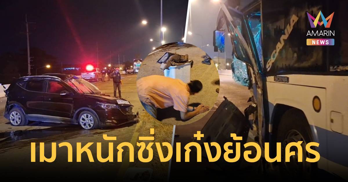 หนุ่ม ดื่มฉลองงานเลี้ยงเมาหนัก ซิ่งเก๋งย้อนศรบนสะพานต่างระดับชนกับรถทัวร์โดยสารเสียงดังสนั่นยกมือไหว้ร้องไห้โวยวาย เดินบนไปทั่วบนถนน