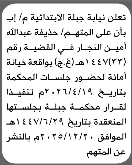 تعلن نيابة جبلة م/إب بأن على المتهم حذيفة النجار الحضور الى المحكمة