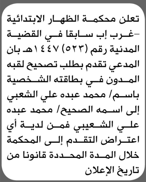 تعلن محكمة الظهار أن المدعي محمد الشعيبي تقدم بطلب تصحيح اسم