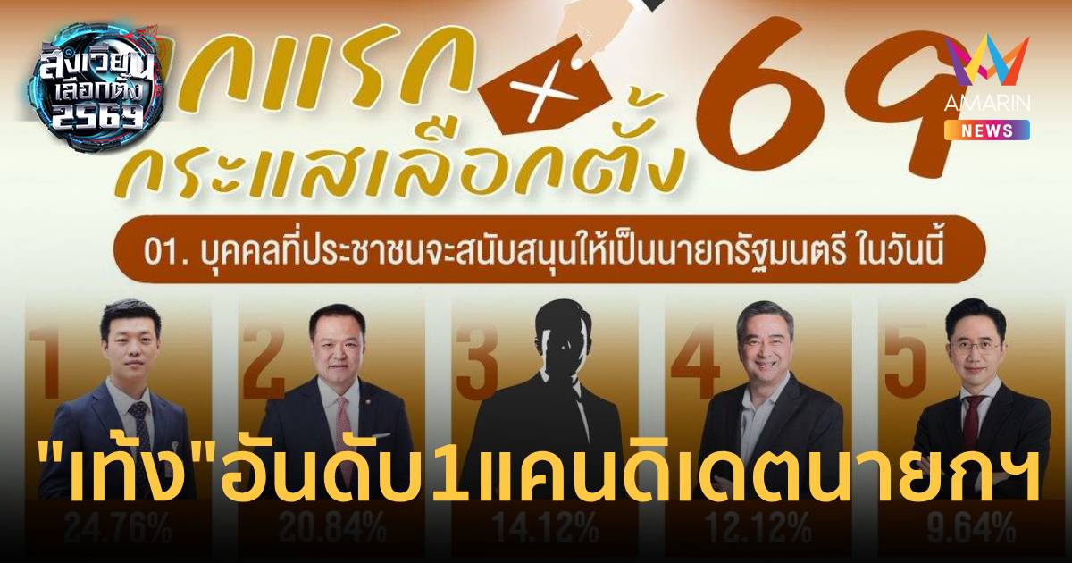 นิด้าโพล เผยผลสำรวจ"ยกแรก กระแสเลือกตั้ง69"เท้ง"อันดับ1เป็นแคนดิเดตนายกรัฐมนตรี ด้วยคะแนนร้อยละ 24.76 อันดับ2"อนุทิน"20.84% ขณะ"อภิสิทธิ์"อันดับ4