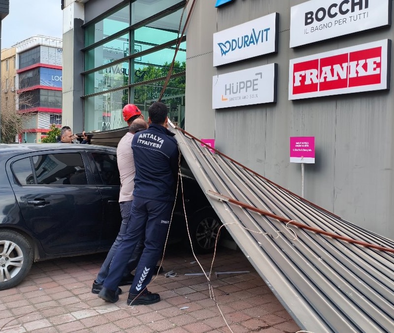 Antalya’da saatte 50 kilometreye ulaşan kuvvetli rüzgâr nedeniyle çatılar uçtu, park halindeki bir aracın üzerine tabela devrildi, elektrik telleri koptu.