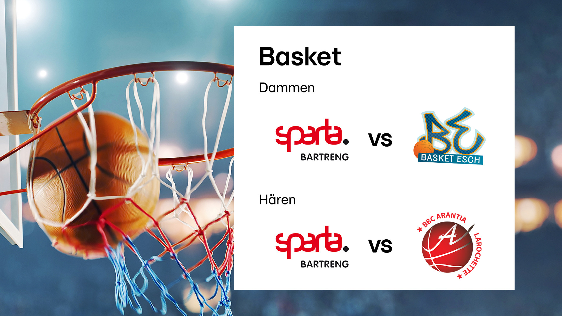 Basket LIVE - Coupe 1/2-Finallen - dëse Sonndeg: De Match Sparta Bartreng géint Arantia Fiels vu 17.25 Auer un am Livestream