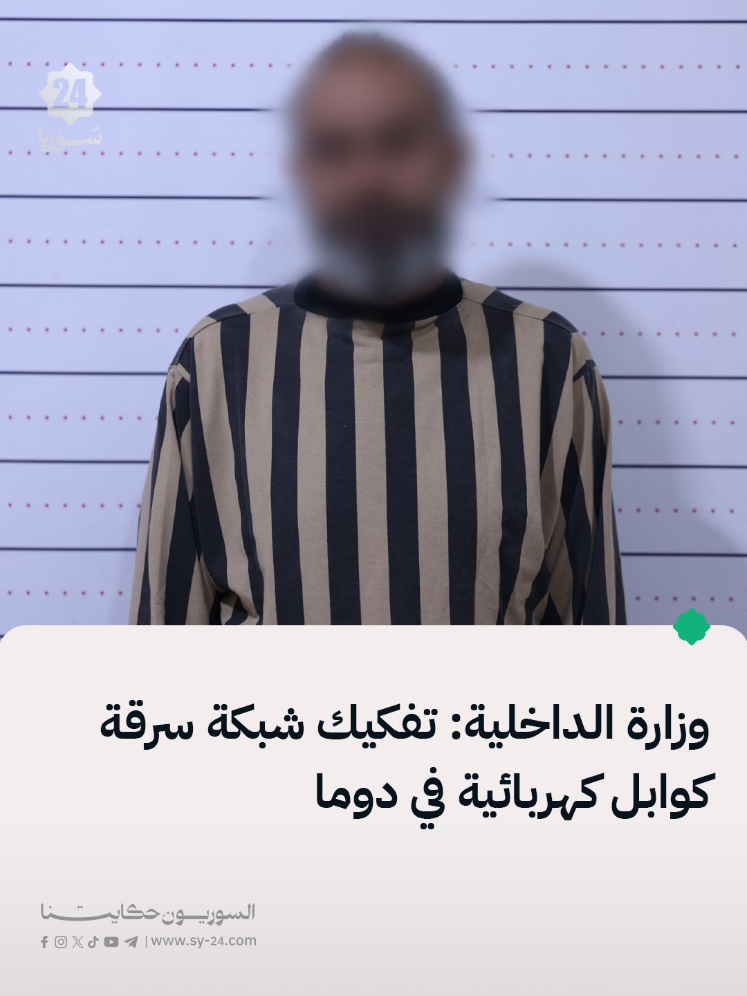 وزارة الداخلية: الأمن الداخلي في دوما يفكك شبكة متخصّصة بسرقة الكوابل الكهربائية والاتجار بها بعد تقطيعها وصهرها. المتابعة الميدانية أسفرت عن تحديد هويات أفراد الشبكة وأماكن وجودهم. القوى الأمنية نفّذت عملية محكمة وألقت القبض على ستة متورطين. ضبط كميات كبيرة من الكوابل المسروقة والأدوات المستخدمة في أعمال السرقة والتصريف. إحالة المقبوض عليهم إلى القضاء المختص […] The post الأمن الداخلي في دوما يفكك شبكة متخصّصة بسرقة الكوابل الكهربائية والاتجار بها بعد تقطيعها وصهرها. appeared first on SY24 .