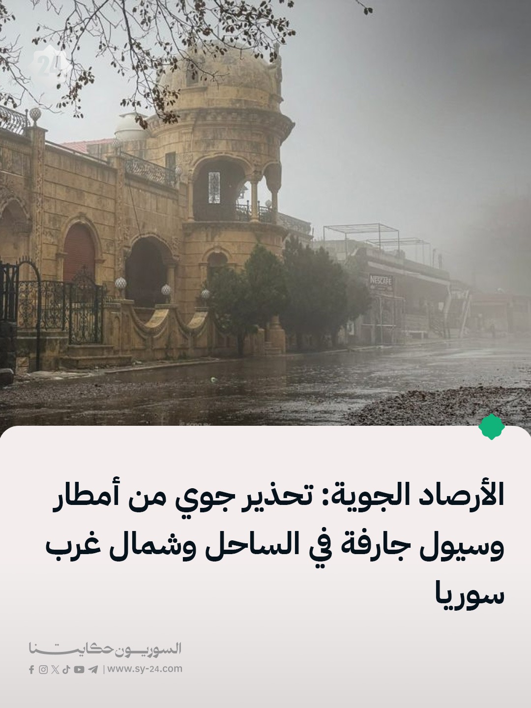 الأرصاد الجوية السورية: نحذر المناطق الساحلية من الأمطار الغزيرة والعواصف الرعدية والصواعق الهابطة غداً الاثنين المناطق الشمالية الغربية عامة معرضة لغزارة الأمطار وحدوث السيول في الوديان والمنحدرات الأرض مروية شمال غرب البلاد، والهطولات الغزيرة المرتقبة خاصة بعد الظهر والمساء والليل ستسبب السيول الجارفة على سكان المنخفضات أخذ أقصى درجات الحذر، ونتمنى السلامة للجميع يتشكل الضباب […] The post الأرصاد الجوية السورية: appeared first on SY24 .
