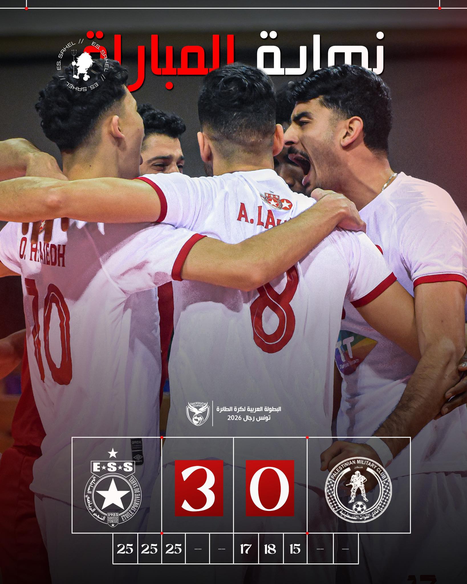 فاز النجم الساحلي اليوم الأحد على نادي القوات الفلسطينية بنتيجة 3-صفر (25-17، 25-18، 25-15)، في إطار الجولة الرابعة من منافسات المجموعة الثانية لـ بطولة الأندية العربية للكرة الطائرة، في نسختها الرابعة والأربعين، التي تحتضنها تونس من 8 إلى 17 جانفي الجاري بمشاركة 11 فريقًا. --- المجموعة الأول