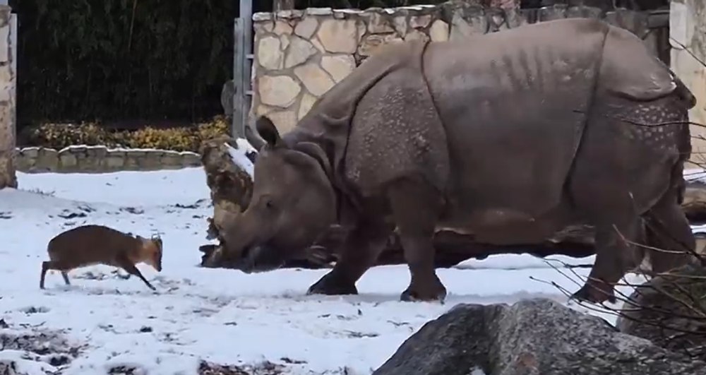 Un cerb muntjac, de nici jumătate de metru, a devenit vedetă pe internet după ce a avut curajul să se ia la „trântă” cu un rinocer uriaș.