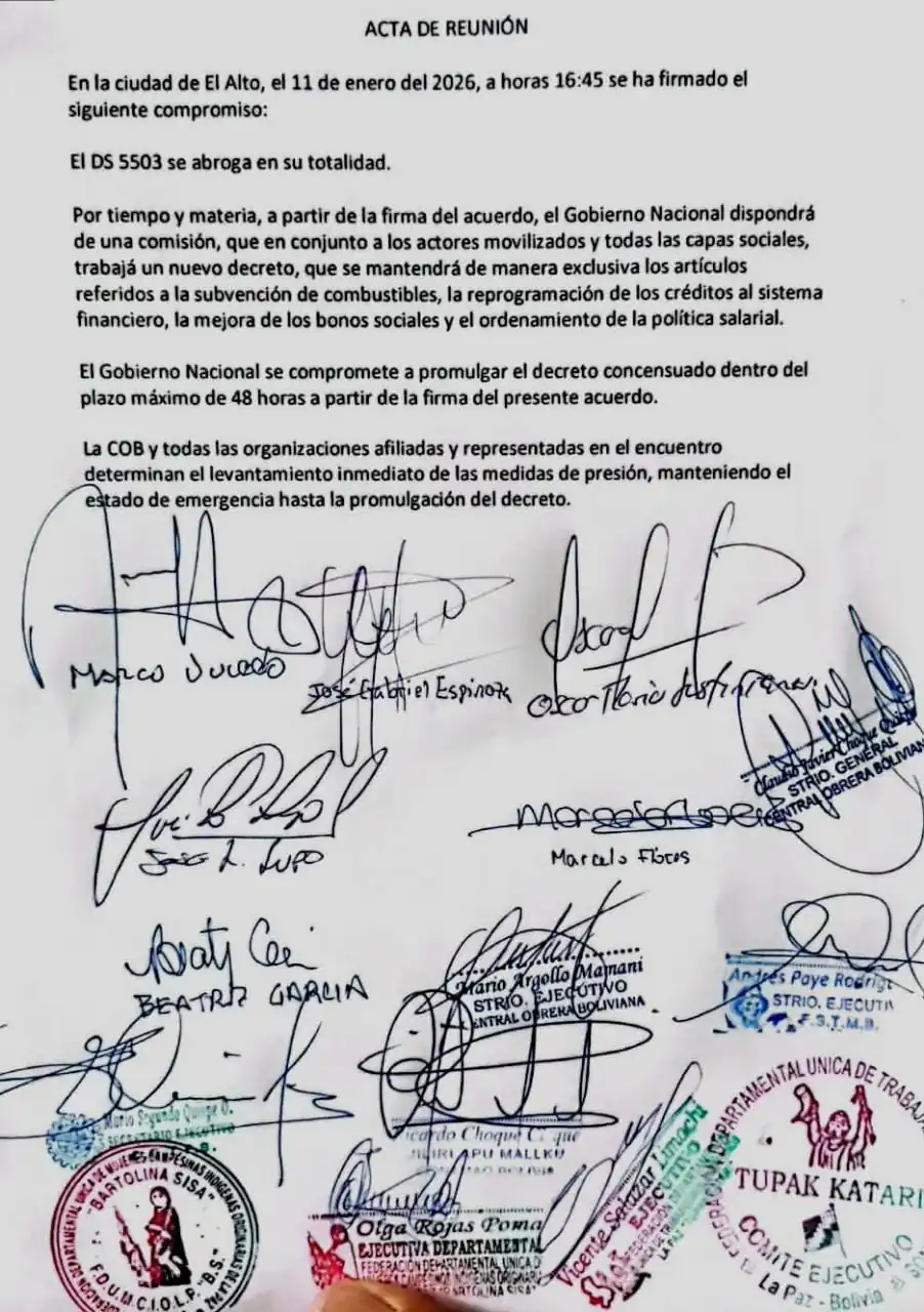 La tarde de este domingo, la Central Obrera Boliviana (COB) y el Gobierno firmaron un “compromiso” para la abrogación del polémico Decreto Supremo 5503. The post ‘El DS 5503 se abroga en su totalidad’: ¿qué dice el acuerdo? appeared first on La Razón .