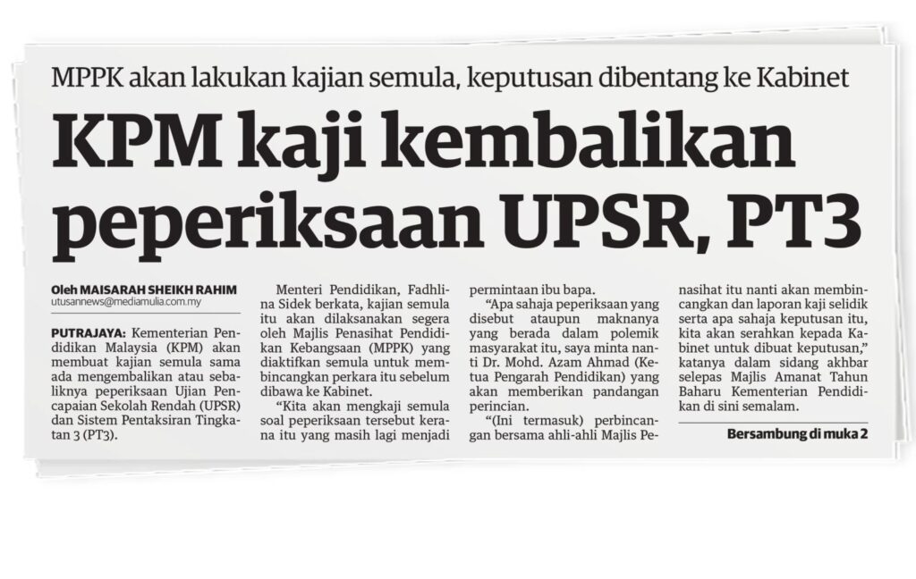 PETALING JAYA: Cadangan Kementerian Pendidikan Malaysia (KPM) mengembalikan peperiksaan awam seperti Ujian Pencapaian Sekolah Rendah (UPSR) dan Pentaksiran Tingkatan Tiga (PT3), wajar dalam menangani kelemahan sistem penilaian pendidikan sedia ada. Presiden Majlis Permuafakatan Persatuan Ibu Bapa dan Guru Nasional (PIBGN), Prof. Madya Datuk Dr. Mohamad Ali Hasan berkata, situasi tanpa peperiksaan nasional yang bersifat piawaian ... Read more The post UPSR, PT3 atasi ketiadaan penanda aras prestasi murid – PIBGN appeared first on Utusan Malaysia .