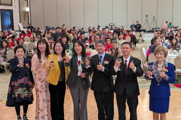2026年1月10日,海关会举办首届乡亲大会,逾四百人参与。(前排左起)海关会台北分会副会长吴伊华、海关会副总会长陈淑容、洛侨中心主任钟佩珍、经文处副处长陈令欣、海关会总会长苏俊成、大洛区会长傅锦郎、海关会台北分会会长邱玲儿。(徐曼沅/大纪元)