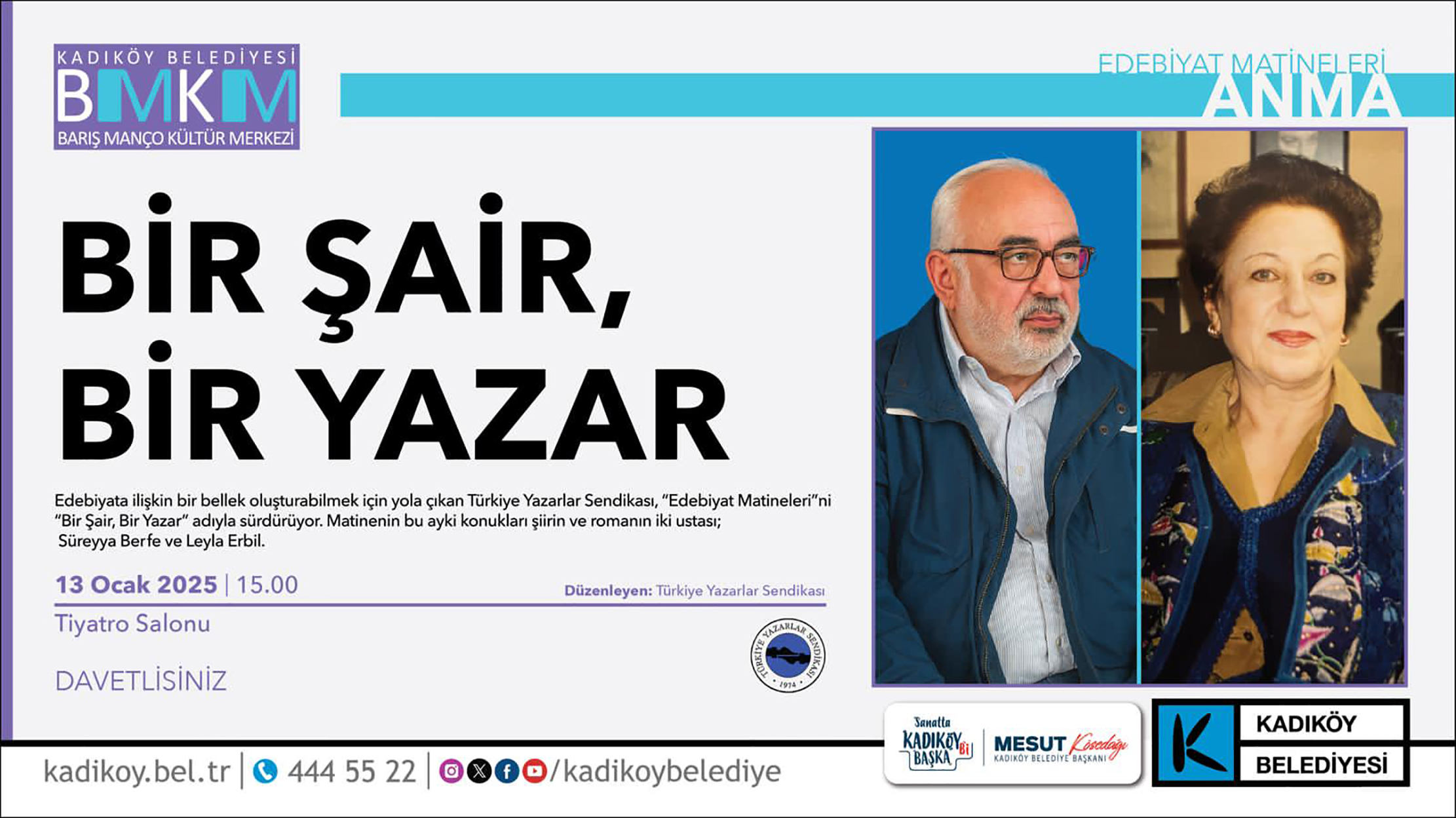 Türkiye Yazarlar Sendikası ile Kadıköy Belediyesi’nin işbirliğiyle sürdürülen Edebiyat Matineleri, edebiyatın belleğini diri tutan buluşmalarına “Bir Yazar, Bir Şair” temasıyla devam ediyor. Bu kez Türk edebiyatının iki ayrı damardan beslenen, ancak aynı toplumsal duyarlılıkta buluşan iki güçlü kalemi anmak için bir araya geliniyor: Şair Süreyya Berfe ve yazar Leyla Erbil. Toplumun, kadının ve emeğin sesini yazınsal cesaretle büyüten bu ... Read more The post Edebiyat Matineleri’nde İki Güçlü Ses: Süreyya Berfe ve Leyla Erbil first appeared on Edebiyat Haber .