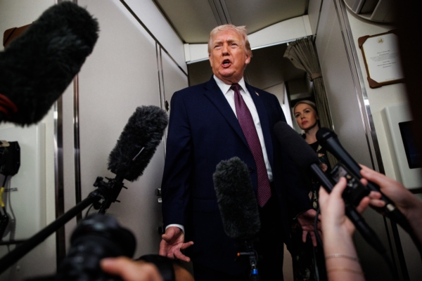 2026年1月11日,美国总统川普搭乘空军一号专机返回白宫时,接受记者提问。(Samuel Corum/Getty Images)