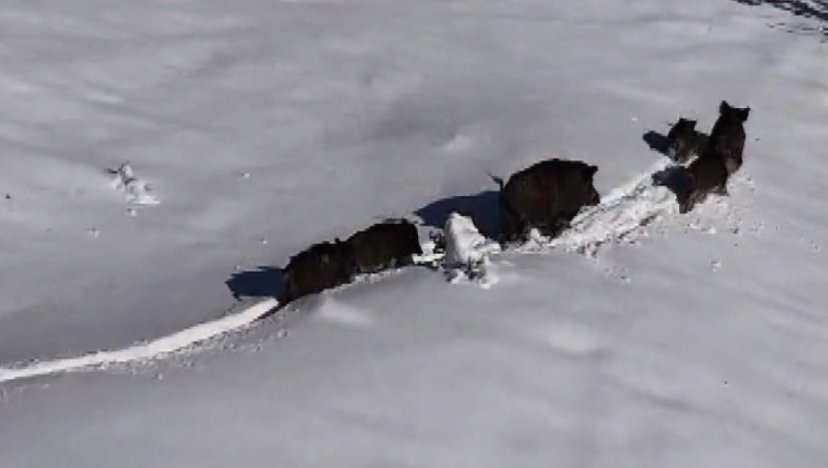 Karlı arazide ilerleyen domuz sürüsü havadan görüntülendi