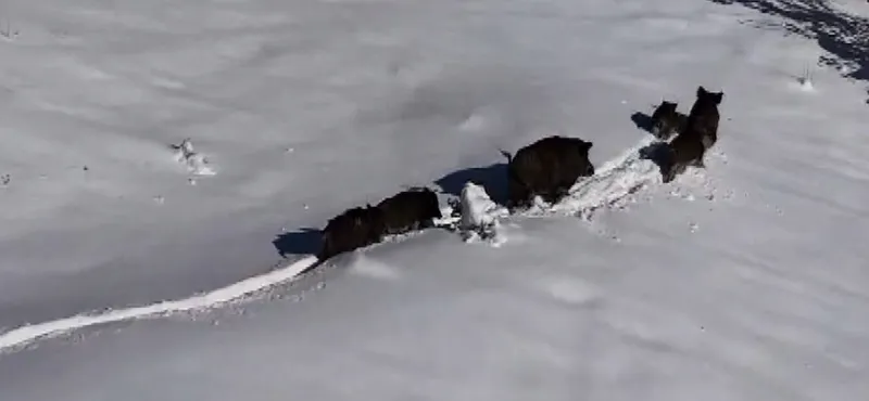 Karlı arazide ilerleyen domuz sürüsü havadan görüntülendi