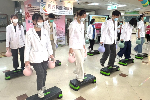 桃疗职能治疗师亲自示范下肢阻力性登阶训练。(卫生福利部桃园疗养院提供)