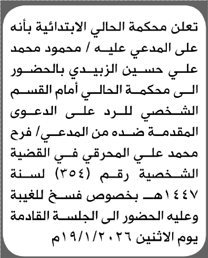 تعلن محكمة الحالي أن على المدعى عليه محمود الزبيدي الحضور إلى المحكمة