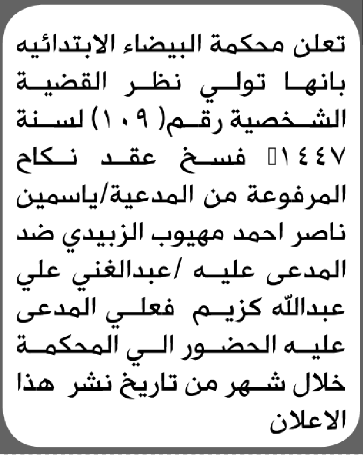 تعلن محكمة البيضاء أن على المدعى عليه عبدالغني كزيم الحضور إلى المحكمة