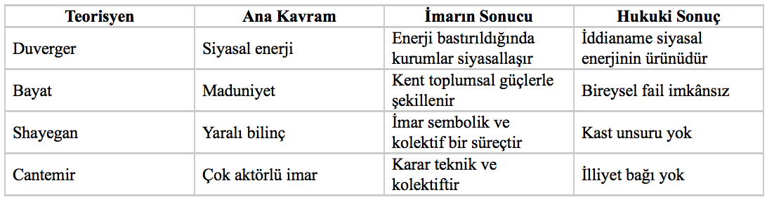 Modern siyasal rejimlerin istikrarını anlamak için siyasal enerjinin devlet mekanizmasıyla ilişkisini anlamak gerekir. Maurice Duverger’in Siyasal Partiler (1986) adlı klasik eseri, siyasal partileri yalnızca rekabet eden örgütler olarak değil, toplumsal enerjiyi sistem içine çeviren kanallar olarak ele alır. Ona göre bir partiyi iktidara taşıyan siyasal enerji, iktidar tarafından emilmez, dağıtılmaz ve sisteme entegre edilmezse, bastırılmış enerji “yeraltına” kayar ve iki risk doğurur: terörizasyon ve faşizan kitleleşme (Duverger, 1986, s. 151–159). Bu nedenle siyasal tabanın kadro, mevki, ekonomik pay ve idari etki beklentileri herhangi bir modern rejimde yok sayılamaz; zira bunlar yalnızca “siyasal lüks” değil, Duverger’in vurguladığı gibi rejim güvenliğinin parçasıdır (s. 243–247). Bu çerçeve, günümüz Türkiye’sinde imar süreçlerinin neden sürekli bir siyasal gerilim alanı olduğunu anlamak için önemlidir. Çünkü imar, yalnızca teknik bir idari işlem değil; siyasal taban taleplerinin, toplumsal enerjinin ve kültürel sembol üretiminin kesişimidir. Bu nedenle imar kararlarını bireysel kastla, kişisel çıkar motivasyonuyla veya örgütlü suç iradesiyle açıklamaya çalışmak, siyaset biliminin, kent sosyolojisinin ve ceza hukukunun temel ilkeleriyle açık biçimde çelişir. Bu noktada iddianamede görülen temel mantık hatası şudur: İdarenin kendisinin verdiği bir yetkinin doğal sonuçlarını suçun maddi unsuru gibi göstermeye çalışma eğilimi. Bu durum, şu benzetmeyle en açık biçimde görülebilir: “Örtülü ödenekle bütçesinin %6’sını harcama yetkisi verilen bir kamu görevlisinin evindeki veya yakınının evindeki para hareketlerinin kriminalize edilmesi ne kadar akıl ve hukuk dışıysa, imar sürecinin kanunen tanımlı zorunlu sonuçlarını bireysel suç gibi sunmak da aynı derecede absürttür.” Çünkü devlet bir aktöre takdir yetkisi verdiğinde, o yetkinin sonuçlarını ceza sorumluluğuna konu etmek hem kanunilik hem tipiklik hem de kusur ilkesini ihlal eder. Duverger’in kavramsallaştırmasıyla, böyle bir yaklaşım siyasal rejimin “enerji emme kapasitesini” ortadan kaldırdığı için siyasal alanı kriminalleştirir ve istikrarı zayıflatır (Duverger, 1986, s. 312–315). Bu makalede, Duverger’in siyasal enerji yaklaşımı; Asaf Bayat’ın maduniyet, gündelik direniş ve mekânsal siyaset teorisi; Daryush Shayegan’ın yaralı bilinç ve mağdunların intikamı kavramı; ve Bekir Cantemir’in imar süreçlerinin tarihsel ve idari çok aktörlülüğünü ortaya koyan ampirik çalışması bir araya getirilerek İmamoğlu’na yöneltilen imar suçlamalarının neden teorik, hukuki ve ampirik olarak imkânsız olduğu ortaya konacaktır. Maurice Duverger: Siyasal Enerji, Kadrolaşma, Devlet Kaynakları ve Rejim Güvenliği Üzerine Maurice Duverger’in Siyasal Partiler (1986) adlı klasik eseri, siyasal partilerin toplumsal enerji ile devlet iktidarı arasındaki ilişkiyi nasıl düzenlediğine dair siyaset biliminin en güçlü teorilerinden birini sunar. Duverger’e göre modern siyasal rejimlerin istikrarını belirleyen asıl faktör, partileri iktidara taşıyan “siyasal enerjinin” devlet mekanizmasına nasıl dağıtıldığıdır. Bu enerji şeffaf kanallarla iktidara bütünüyle entegre edilirse rejimler istikrarlı olur; tersine, enerji bastırılır, geri çevrilir veya yok sayılırsa aynı enerji “yeraltına” kayar. Yeraltına kayan siyasal enerji ya terörize olur ya da faşizan kitle davranışlarına dönüşerek rejimi bizzat içeriden tehdit eder (Duverger, 1986, s. 151–159). Bu yaklaşım, demokrasilerde patronaj, kadrolaşma, ihale dağıtımı ve siyasi tabanın devlet imkânlarından pay alma taleplerinin neden sadece yozlaşma değil, aynı zamanda rejim güvenliğiyle ilgili yapısal bir gereklilik olduğunu açıklar. Duverger’e göre siyasal partiler, sadece temsil ya da örgütlenme yapıları değildir; toplumsal enerjiyi sistem içine, kurumsal alanlara ve hukuki çerçevelere yönlendiren emniyet sübaplarıdır. Bu nedenle “iktidarı mümkün kılan enerjinin devlet içinde erimesi ve dağıtılması” rejimin bekası için zorunludur (Duverger, 1986, s. 243). 1.1. Siyasal Enerji ve Rejim Güvenliği Duverger’in temel tezi şudur: “Bir siyasal partiyi iktidara getiren enerji, iktidar mekanizması tarafından emilmezse, enerjinin fazlası yeraltına kayar.” (Duverger, 1986, s. 151) Bu enerji toplumsal taleplerden, örgütlenmeden, ideolojiden, liderlikten ve tabanın devletten beklentilerinden oluşur. Seçim kazanmak için kullanılan bütün kaynaklar—propaganda, kadro mobilizasyonu, finansal destek ve kitle hareketliliği—iktidar kazanıldıktan sonra mutlaka yeniden dağıtılmalıdır. Bu dağıtım yapılmazsa enerji şu şekilde “çürür” ve rejime karşı işleyen bir niteliğe bürünür: • radikalleşme, • sokak hareketleri, • terörize olma, • yeraltı ağlarının oluşması, • kitlesel hayal kırıklığı, • devletten kopma, • faşizan örgütlenme biçimleri. Duverger’e göre bunun nedeni basittir: Siyasi enerji yok olmaz; ya kurumsal alan içinde eritilir ya da sistemin dışına akarak şiddet üretir (Duverger, 1986, s. 157). 1.2. Kadrolaşmanın “yolsuzluk değil rejim sigortası” olması Duverger’in belki de en tartışmalı ancak en güçlü tezlerinden biri şudur: “Parti iktidara geldikten sonra tabanının kadro, iş, mevki ve imkân taleplerini karşılayamazsa, onu iktidara getiren enerji sisteme değil yeraltına akar.” (Duverger, 1986, s. 243) Bu nedenle Duverger, kadrolaşmayı sadece bir “kayırmacılık türü” olarak değil, modern siyasal rejimlerin işleyişinde bir dengeleyici mekanizma olarak ele alır. Kadrolaşma: • siyasal tabanı devletle bağlar, • kitlelerde aidiyet yaratır, • seçim sürecinde