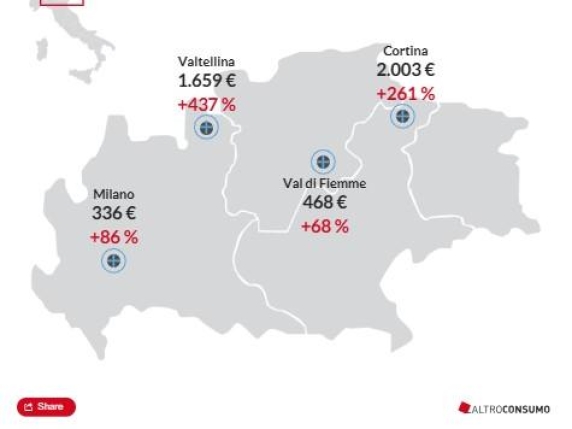 L’indagine di Altroconsumo: Cortina la più cara con in media più di 2 mila euro, segue la Valtellina con 1.700 euro, Milano la meno cara. Ma non c'è stato il boom di prenotazioni atteso