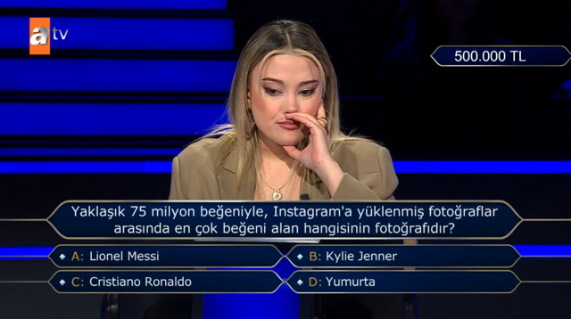 Kim Milyoner Olmak İster’de sorulan 500 bin TL’lik Instagram sorusu geceye damga vurdu. En çok beğeni alan fotoğraf sorusunda yarışmacı “yumurta”yı seçti, doğru cevap Lionel Messi çıktı. Arjantinli yıldızın 2022 Dünya Kupası sonrası paylaştığı kare yaklaşık 75 milyon beğeniyle rekor kırarken yarışmacı 50 bin TL ile elendi.