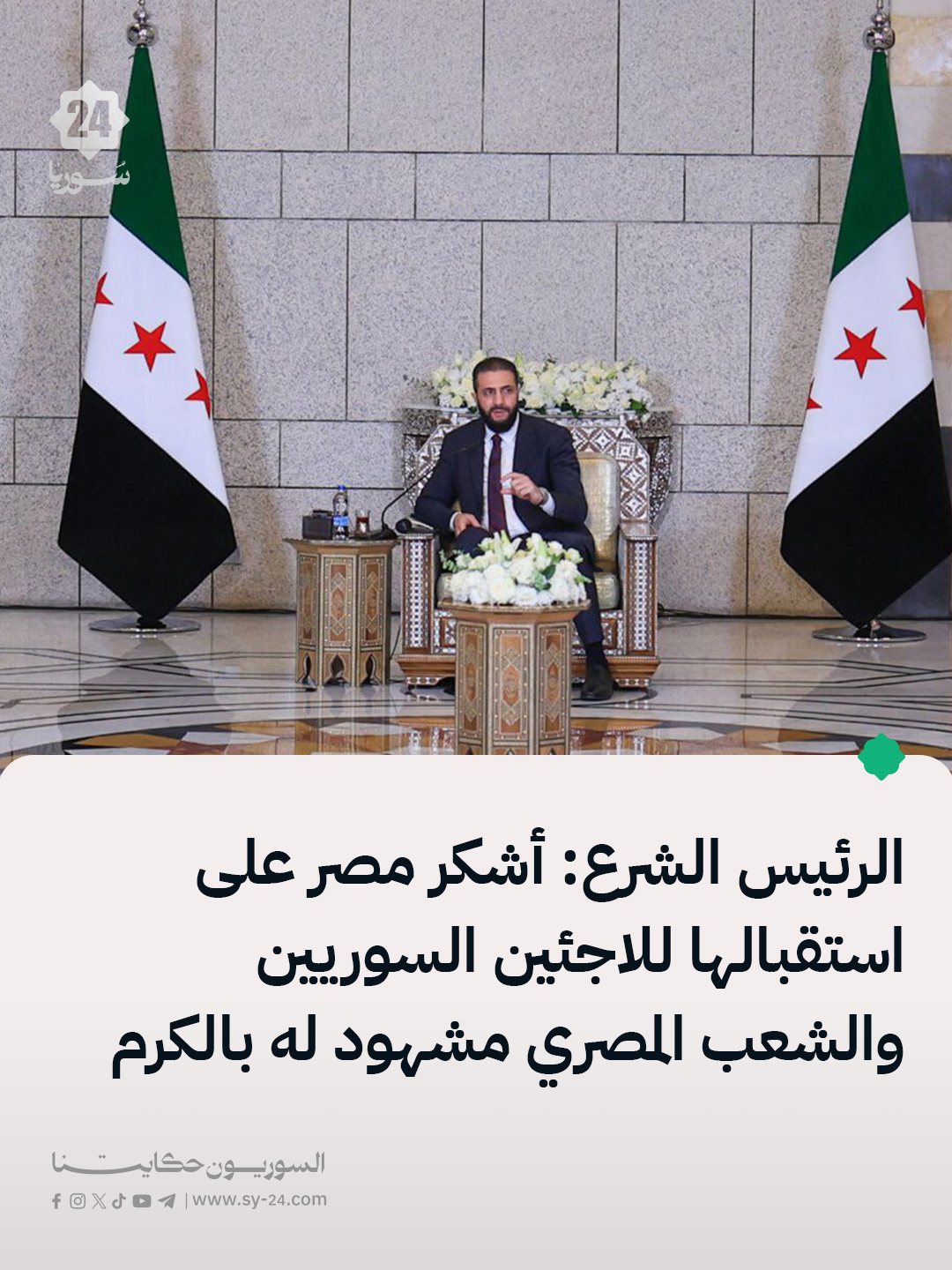 الرئيس أحمد الشرع: أحب أن أشكر مصر والشعب المصري على استقبالهم للسوريين خلال السنوات الماضية هذاشيءليسبالفريقعنأطباعالمصريينالمشهودلهمبالكرم ربما ارتاح السوريون في مصر أكثر من أي مكان أخر The post الرئيس الشرع: أشكر مصر على استقبالها للاجئين السوريين والشعب المصري مشهود له بالكرم appeared first on SY24 .