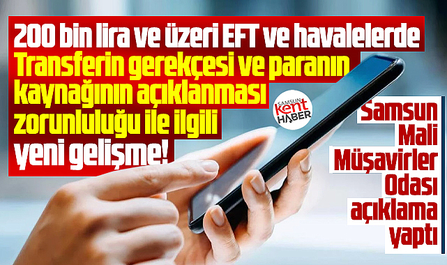 Samsun Serbest Muhasebeci Mali Müşavirler Odası (SMMMO) 200 bin lira ve üzeri EFT ve havalelerde, para transferinin gerekçesi ve paranın kaynağının açıklanması zorunluluğu ile ilgili yeni gelişmeyi açıkladı.