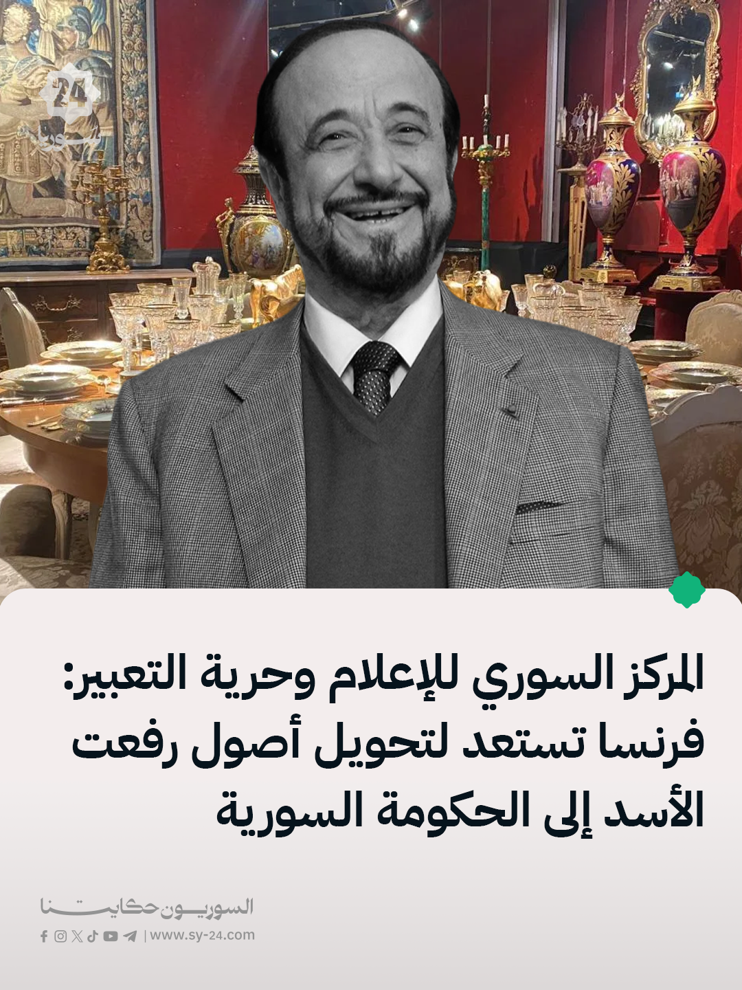 مدير المركز السوري للإعلام وحرية التعبير مازن درويش: الحكومة الفرنسية تستعد لتحويل 32 مليون يورو من أصول رفعت الأسد إلى الحكومة السورية. ستُحوَّل باقي الأصول تدريجياً، مع العمل على توسيع المصادرات لتتجاوز 80 مليون يورو وتشمل عقارات جديدة في فرنسا. وُقّعت بروتوكولات بين الحكومتين، ومن المتوقع أن تحدد الحكومة السورية مجالات الإنفاق […] The post المركز السوري للإعلام وحرية التعبير: فرنسا تستعد لتحويل أصول رفعت الأسد إلى الحكومة السورية appeared first on SY24 .