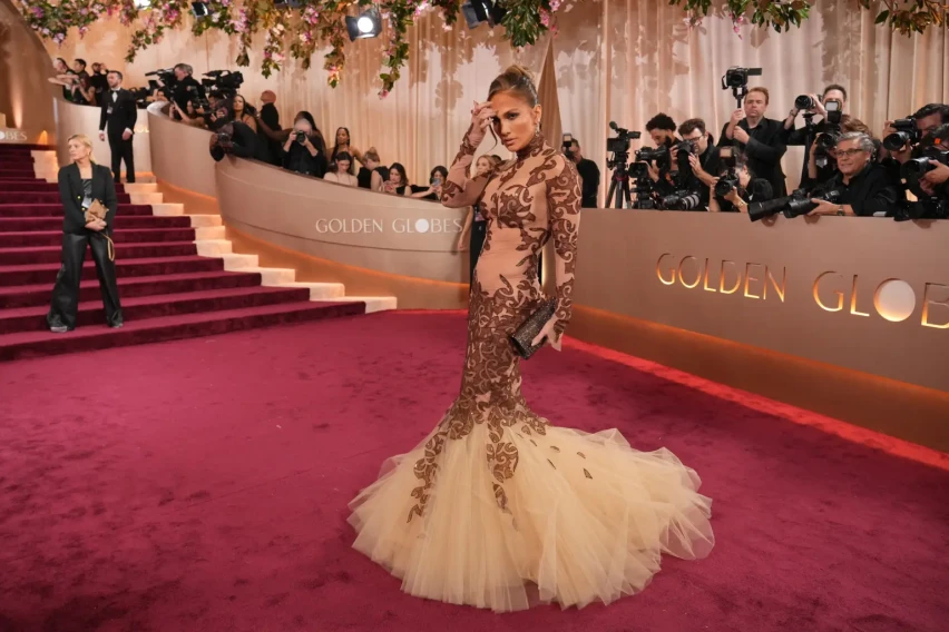 Џенифер Лопез привлекла големо внимание на доделувањето на Златните глобуси 2026 година и без номинација – се појавила како водителка во гламурозен проѕирен фустан со бронзени детали.
