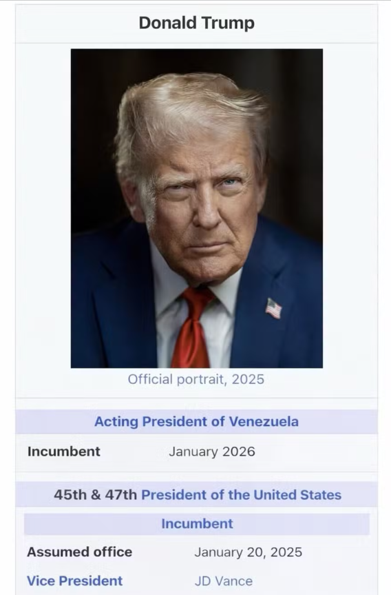 O presidente americano publicou na rede Truth Social uma montagem que simula uma biografia no formato da Wikipedia, na qual aparece listado como presidente interino da Venezuela, com mandato iniciado em janeiro deste ano e sem data de término The post Trump publica montagem em que aparece como ‘presidente interino’ da Venezuela appeared first on InfoMoney .