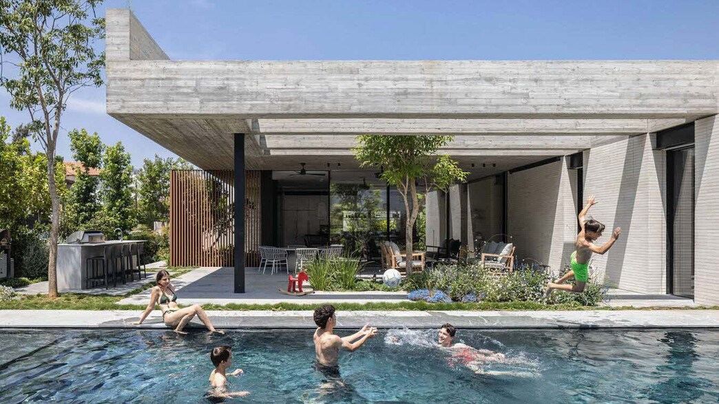 על מגרש פינתי ותלול במרכז הארץ נבנה בית משפחתי דו-מפלסי, שמנצל את הטופוגרפיה ליצירת הפרדה חכמה בין מגורים, עבודה ואירוח. קורות בטון חשוף, קיר לבני סיליקט, פטיו פנימיים וחדירת אור מבוקרת מגדירים אדריכלות ברורה