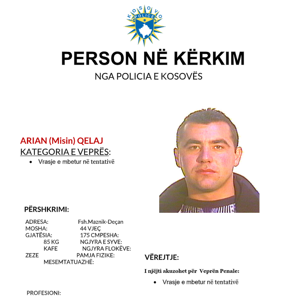 Policia e Kosovës kërkon bashkëpunim me qytetarët për lokalizimin dhe rrjedhimisht arrestimin e tre të dyshuarve për plagosjen e një personi në Pejë. Sipas një njoftimi për media Policia ka bërë të ditur edhe emrat dhe fotografitë e tyre: “Arian (Misin) Qelak i lindur me 20.06.1981 nё fsh. Maznik-Deçan. YLL (Arian) Qelaj i lindur me 29.07.2003 nё fsh. Maznik-Deçan. Altin ( Rifat) Qelaj i lindur me 01.10.2005 nё fsh. Maznik-Deçan”. Tutje në njoftim thuhet se tё pandehurit kërkohen për veprën penale: Vrasje e mbetur në tentativë Policia e Kosovës kërkon nga qytetarët e Republikës së Kosovës që kushdo që ka informacion për vendndodhjen e personave të dyshuar në fotot e bashkangjitura, të lajmërojë Policinë e Kosovës apo të lajmërohet në stacionin më të afërt policor. /Telegrafi/