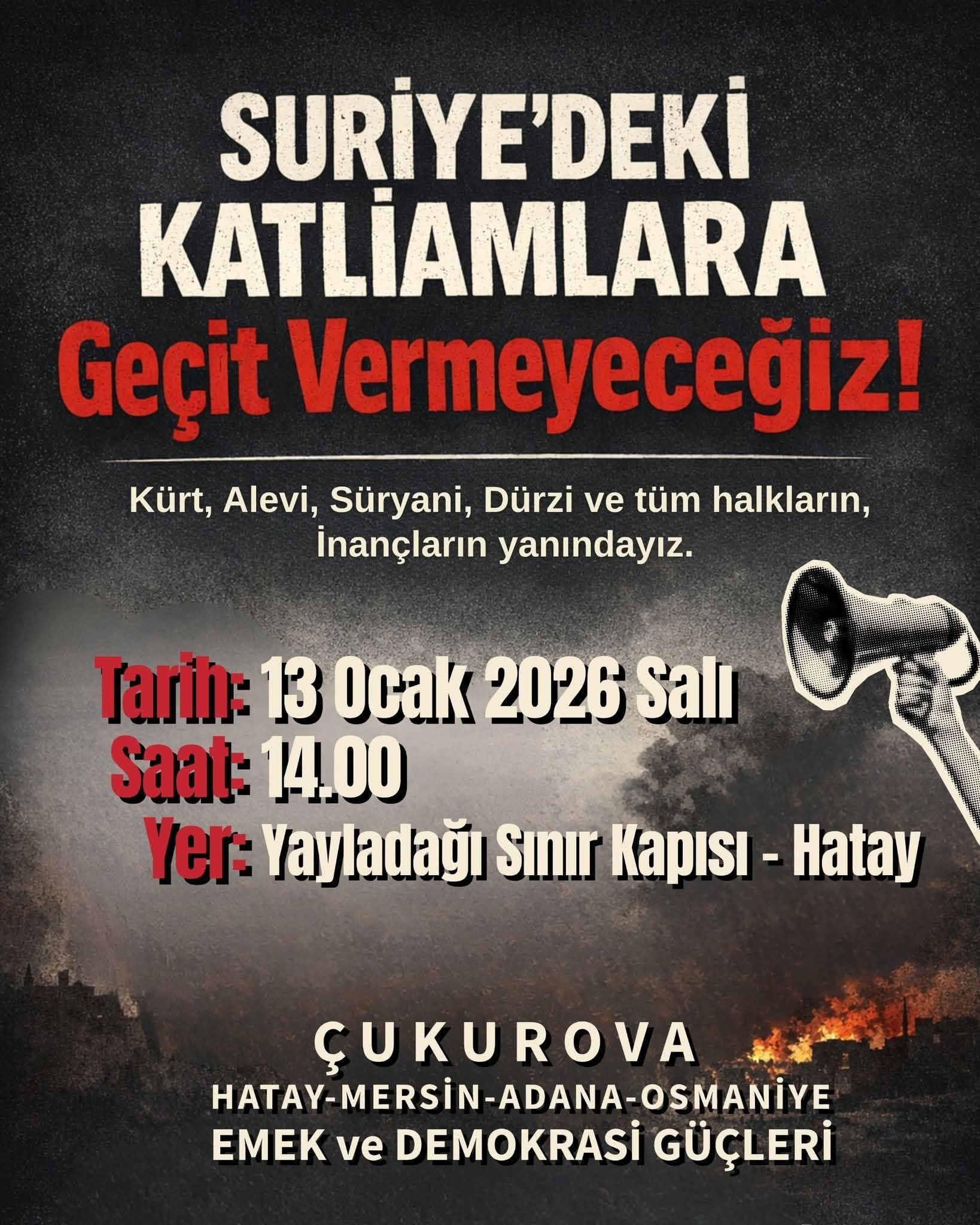 Suriye’de farklı halk ve inançlara yönelik sürdürülen katliamlara karşı tepkiler büyüyor. Çukurova Emek ve Demokrasi...
