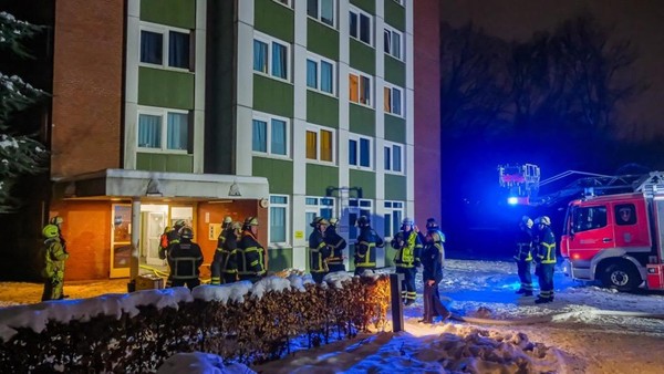 Feuerwehr im Großeinsatz: Feuer im 5. OG eines Wohnhauses. Schwangere Bewohnerin unverletzt. Haus evakuiert. Brandursache unklar.