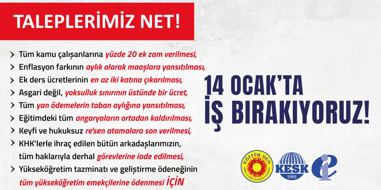 Eğitim Sen, artan yoksulluk, angarya uygulamalar ve maaşların erimesine karşı 14 Ocak’ta ülke genelinde iş bırakma kararı aldı. Talepler ve gerekçeler haberimizde.