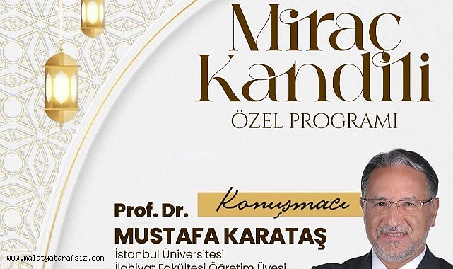 Battalgazi Belediyesi tarafından Miraç Kandili dolayısıyla düzenlenecek özel programda İstanbul Üniversitesi İlahiyat Fakültesi Öğretim Üyesi Prof. Dr. Mustafa Karataş vatandaşlarla buluşacak.