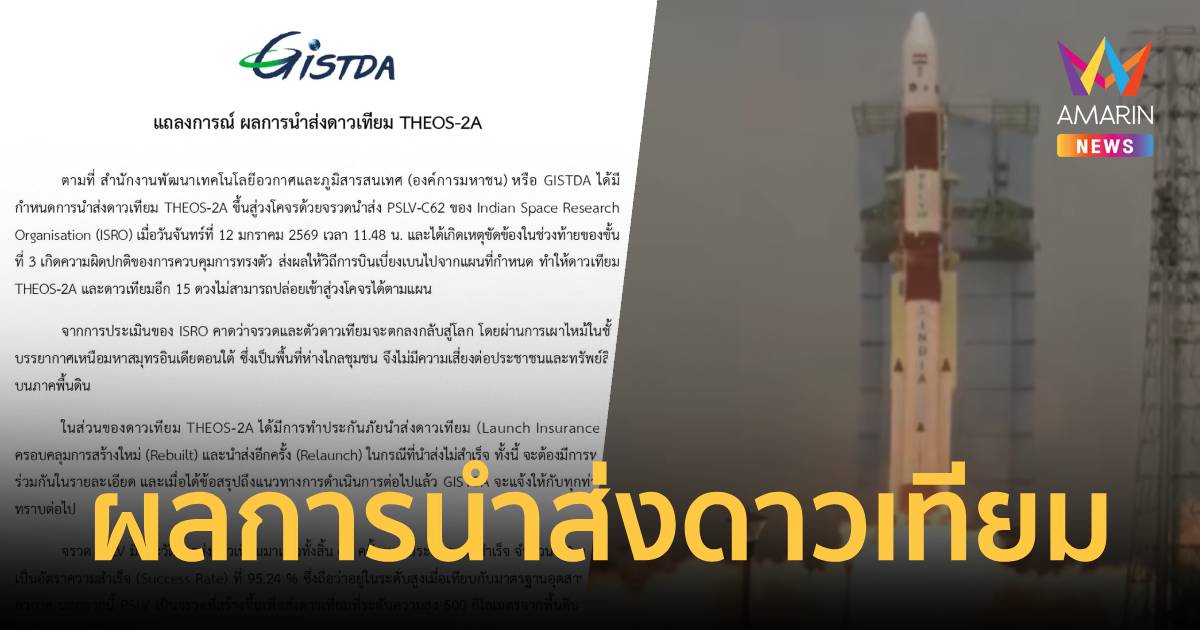 GISTDA ออกแถลงการณ์ ผลการนำส่ง THEOS-2A เกิดความผิดปกติที่ตัวจรวด ดาวเทียม ไม่สามารถเข้าสู่วงโคจรได้ คาด จะตกกลับสู่โลก เหนือมหาสมุทรอินเดียตอนใต้
