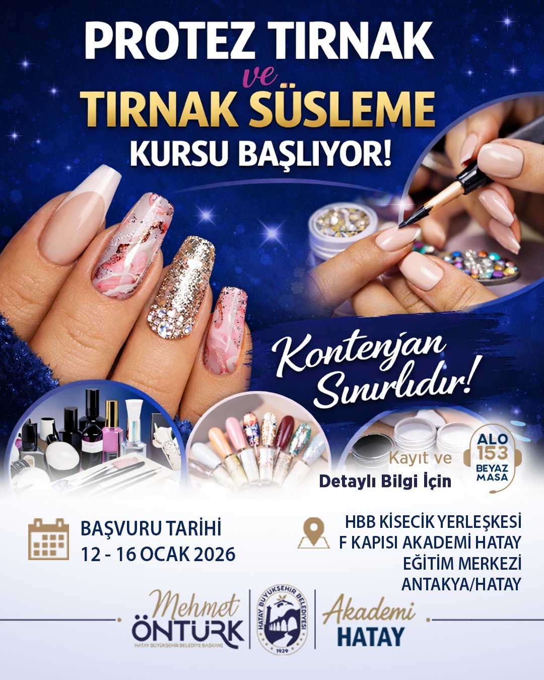 Hatay Büyükşehir Belediyesi, Akademi Hatay bünyesinde Protez Tırnak ve Tırnak Süsleme Kursu açıyor. Profesyonel tırnak bakımına ilgi duyanlar için hazırlanan eğitim programı, sınırlı kontenjanla gerçekleştirilecek. Kursa başvurular 12 – 16 Ocak 2026 tarihleri arasında alınacak. Eğitimler, HBB Kisecik Yerleşkesi F Kapısı Akademi Hatay Eğitim Merkezinde düzenlenecek. Kayıt yaptırmak ve detaylı bilgi almak isteyenler, ALO 153 […] The post Hatay’da güzellik ve bakım eğitimine ilgi artıyor first appeared on Antakya Gazetesi .